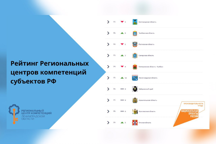 Рейтинг опубликован Федеральным центром компетенций в сфере производительности труда. За год Региональный центр компетенций Ленинградской области повысил свою позицию на 11 пунктов.